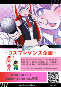 コスプレをしたメンバーが、ボカロ・アニソンと共に踊ります!あなたの好きなキャラクターと、写真が撮れちゃうかも...!?ぜひ見に来てください!