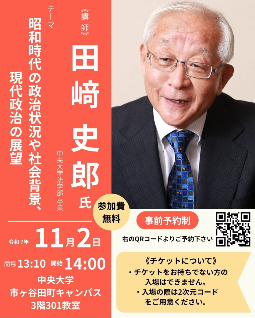 田﨑先生には、昭和時代の政治・社会状況から現代政治の展望まで、幅広いテーマでご講演いただきます。